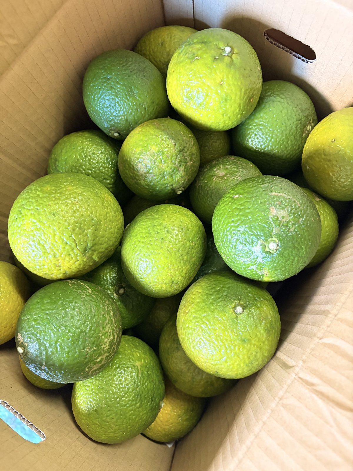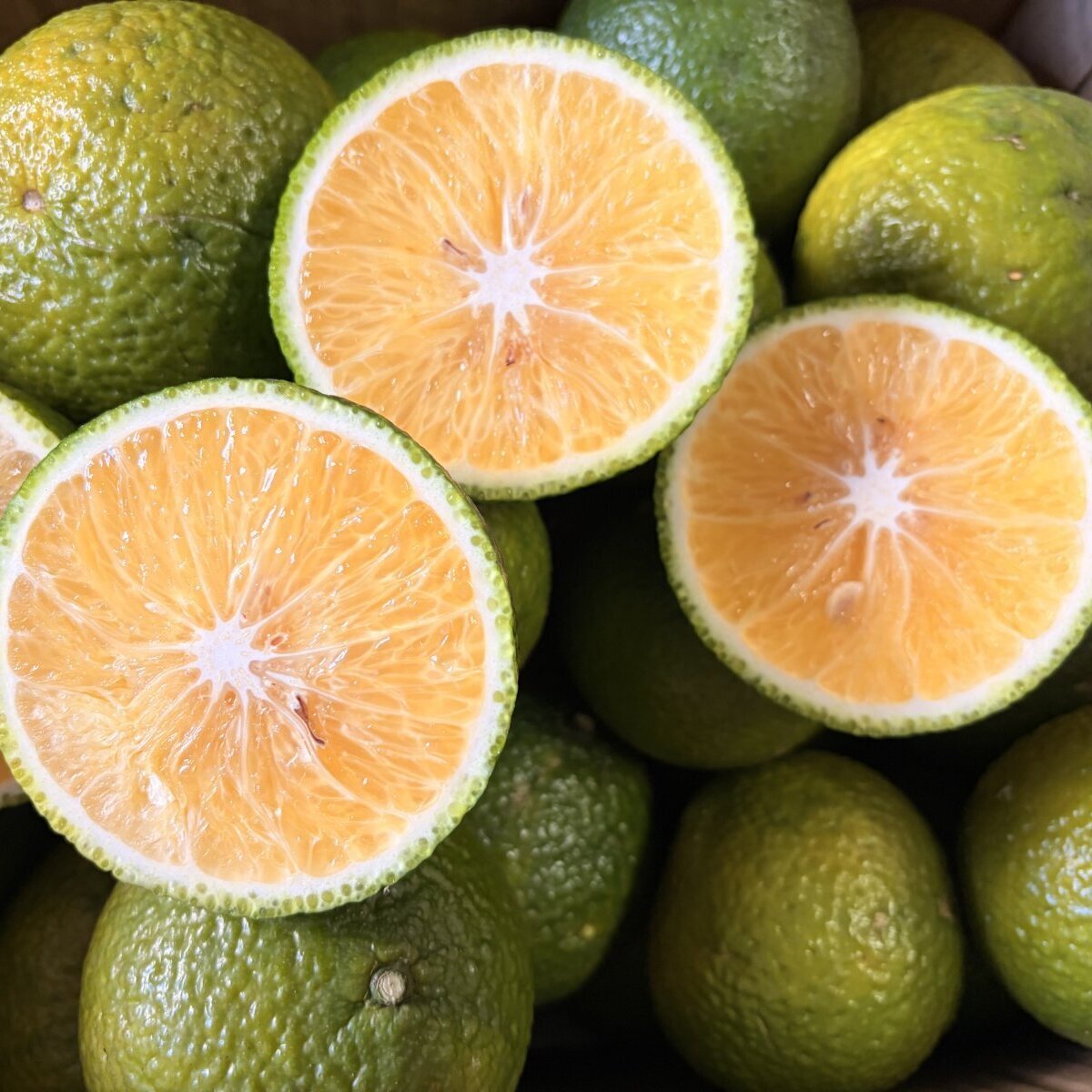皮や見た目はゴツゴツしていて、緑色の柑橘類です。